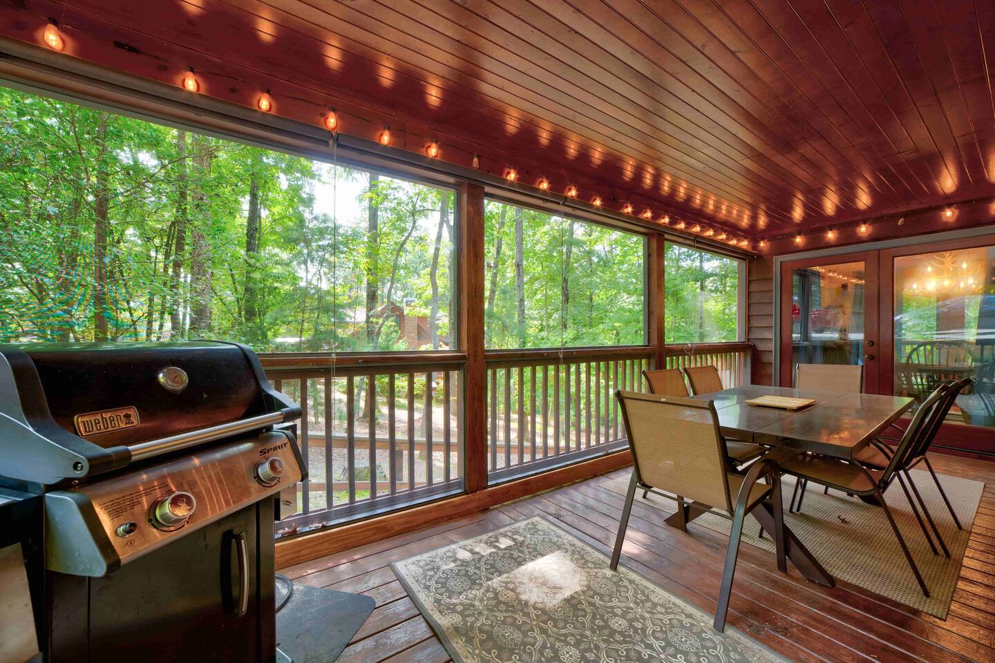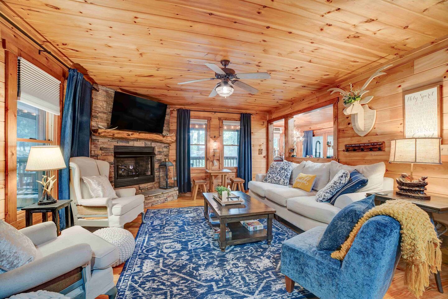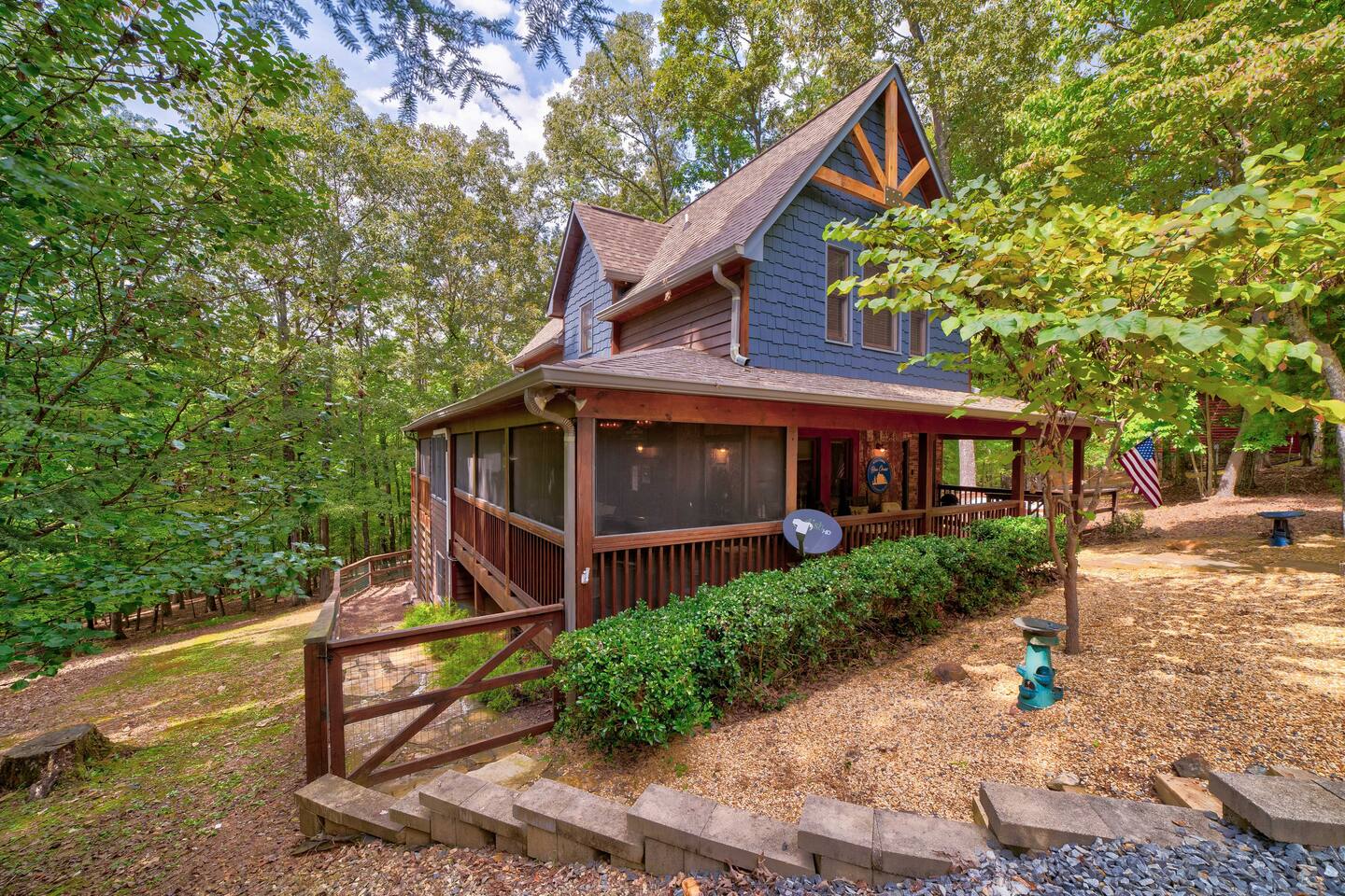 Escape to Blue Chalet, a cozy haven 15 mins from Blue Ridge! 🌲 Fully remodeled, enjoy Cape Cod vibes with high-end furnishings and a grand fireplace. 🛋️✨ Details to Note: 🚗 Paved road, easy access to gated community. 🛏️ Sleeps 8 - 2 kings, 1 queen, 2 twins. 🌳 Multiple screened porches, hot tub, and firepit. 🐕 Extremely dog-friendly with fenced yard and amenities. 🍽️ Fully equipped kitchen with stainless steel appliances. 🎮 Game room fun with pool table and Smart TV. 📶 Unlimited WiFi for seamless connectivity. ❄️ Mini split AC/Heat for optimal temperature control. 🚿 Main level master bath, walk-in shower, granite vanity. 📺 Smart TV streaming for entertainment. Book your stay at Blue Chalet - where every detail ensures a memorable retreat! 🌟